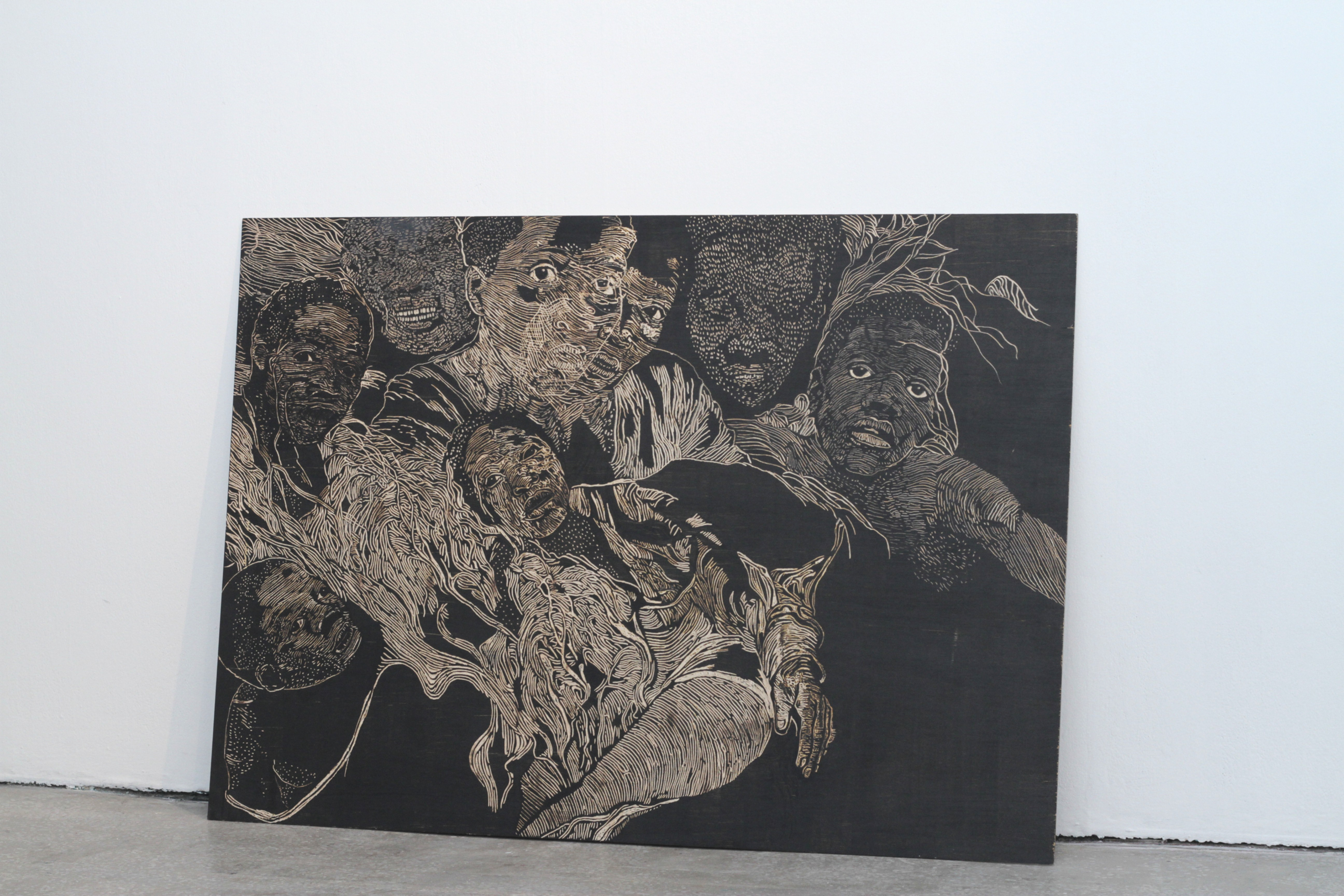 Unprinted woodcut on a plywood block. The surface holds the pressure of the carved wood, making the image feel embedded within the material rather than placed upon it. Photograph by Alana Lake